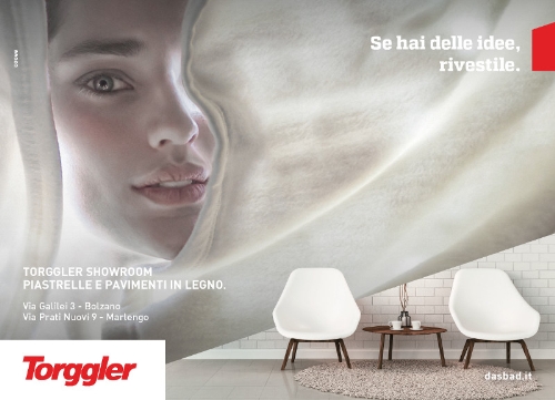 Il concept, sviluppato sempre dall’agenzia Cooee, prosegue con il mood utilizzato per la promozione della divisione arredobagno: è una donna ad attrarre il pubblico e a guidarlo alla scoperta delle novità Torggler. Design, stile, decorazione: questi i concetti trasmessi dal claim “Se hai delle idee, rivestile”. La bellezza è l’abito che riveste il nostro animo, l’idea di noi stessi che vogliamo indossare ogni giorno.