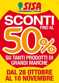 Al via la nuova promozione di Sisa 'Sconti fino al 50%', valida dal 28 ottobre al 10 novembre su tanti prodotti dell’Industria di Marca, dagli alimentari confezionati alla cura casa, dai surgelati alla cura della persona.A supporto di questa nuova iniziativa promozionale uno spot tv di 20 sec. che andrà in onda dal 28 ottobre al 2 novembre sui canali tematici Real Time (canale 31 del Digitale Terrestre e 124 di Sky) e Giallo (canale 38 del Digitale Terrestre).