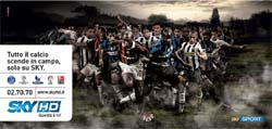 SKY vanta l'esclusiva dei principali eventi sportivi e i diritti di tutte le squadre di calcio che vediamo epicamente rappresentate nelle immagini delle affissioni con una mandria di migliaia di calciatori che corrono agguerriti tra i prati verdi con il pallone tra i piedi.