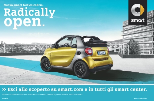Con il claim 'Radically Open', smart sottolinea con vigore il plus più entusiasmante del suo prodotto, ma dà anche un punto di vista nuovo al concetto di libertà della cabrio, girandolo proprio sul cliente finale, che viene invitato a sentirsi libero di esprimere finalmente il proprio pensiero: in poche parole, ad uscire allo scoperto.