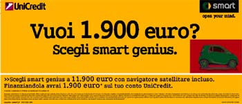 La campagna pianificata in televisione e in affissione, promuove un'operazione commerciale: i clienti che entro il 30 giugno 2011 acquisteranno una smart genius, finanziandola attraverso l’apertura di un conto corrente presso UniCredit, riceveranno entro i successivi 60 giorni un accredito di 1900 Euro sul proprio conto corrente Unicredit. Firmano il progetto, sotto la supervisione creativa di Gianpietro Vigorelli, Giulio Brienza (copy) e Letizia Ziaco (art). Cdp Film Deluxe Berlino.