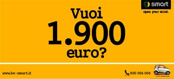 La prima fase - in affissione a partire dal 9 maggio per una settimana - pone semplicemente la domanda: “Vuoi 1900 euro?”. A questa seguirà un secondo flight di affissioni, con la risposta e la spiegazione dell’intera operazione commerciale: “Scegli smart genius”.
