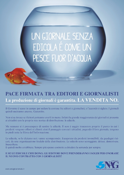 SNAG, attraverso questa campagna stampa dal claim Un giornale senza edicola è come un pesce fuor d’acqua, rivendica un ruolo di maggior rilievo per i punti vendita all’interno della discussione sul rilancio dell’editoria. La similitudine offre molteplici interpretazioni. Senza un rinnovato accordo di filiera e ad un impianto normativo rinnovato e certo, ad agonizzare sono infatti tutti gli attori: editori, giornalisti, distributori ed edicole.