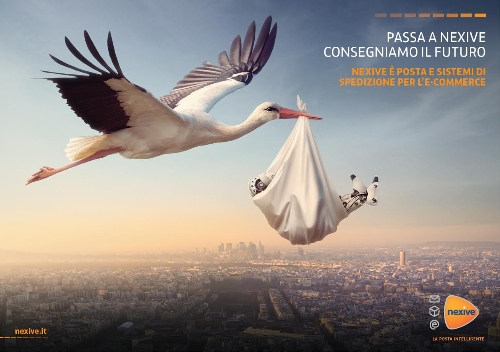La campagna, firmata dall'agenzia Gerundio, prevede un soggetto istituzionale e due di prodotto, uno dei quali sarà svelato solo in un secondo flight di campagna a Settembre. L’annuncio istituzionale sfrutta un key visual di grande memorabilità che esprime al contempo i valori di tradizione e innovazione da sempre tipici di Nexive: una cicogna porta in volo un baby androide stagliandosi in un cielo screziato dai colori dell’alba su un panorama cittadino molto contemporaneo e suggestivo; l’animale tradizionalmente decodificato come “portatrice di novità” consegna il futuro, incarnato da una tecnologia di ultima generazione.