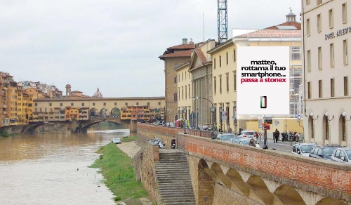 Una Maxi affissione a Firenze sul Lungarno invita “Matteo” (con riferimento al più celebre rottamatore sindaco e segretario del PD Matteo Renzi) a rottamare il suo attuale smartphone e passare alla creatività italiana, scegliendo Stonex.