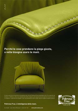 STV ha vinto la gara indetta da Poltrona Frau per le prossime attività di comunicazione e firma la nuova campagna internazionale dell'azienda di arredamento di alta gamma di cui è ad Dario Rinero, pianificata su tutte le principali testate di settore nazionali ed internazionali, su periodica e quotidiana.Scopo della comunicazione è rappresentare il valore fondamentale per l’azienda: l’intelligenza delle mani esperte dei suoi artigiani, che seguono le principali fasi di lavorazione e scelgono materiali pregiati. I protagonisti della campagna sono cuciture, finiture, impunture, pieghe, rughe della pelle di divani e poltrone. Tutti fotografati in macro, per raccontare il lavoro che c’è dietro ogni singolo dettaglio.