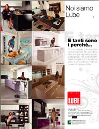 Noi siamo la Lube': Sono nove i messaggi della campagna 2009 di Cucine Lube che si sono susseguiti nel corso dell’anno, a partire da marzo ad oggi, andando a comporre un mosaico di valori che caratterizzano il marchio. Un gruppo di 500 persone, 300 composizioni al giorno , 130 modelli differenti di cucine; sono solo alcuni dei numeri che fanno del gruppo marchigiano una delle principali aziende nel settore, con vari modelli che vanno dalla moderna 'Brava', a quella più classica, come 'Agnese', ai modelli come 'Pamela' con le sue forme design.