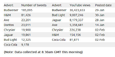 L'elenco di tutti gli spot trasmessi durante il SuperBowl è visibile su AdAge e sul sito del Super Bowl.