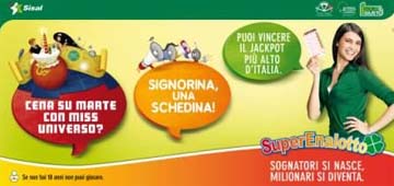 Dopo l’esordio televisivo di mercoledì 23 febbraio, Sisal rinforza la campagna 'Sognatori si nasce, milionari si diventa' con una pianificazione nazionale di affissione nelle principali città italiane.“Due soggetti caratterizzati da una comunicazione popolare e divertente - spiega il Direttore Marketing e Comunicazione di Sisal Michael Staskin - che strappa un sorriso e ricorda il jackpot più alto d’Italia. Negli spot la coppia Amendola-Fassari si rivolge ad una splendida cassiera della ricevitoria Sisal con il tormentone 'Signorina, una schedina!'. Ed è proprio quella signorina, Giulia Lapertosa, ad apparire nella campagna di affissioni.