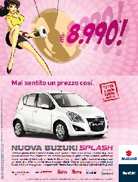 Questa volta, rivolgendosi prevalentemente ad un target femminile, la testimonial d’eccezione è Fujiko, furba e affascinante compagna di Lupin, che propone la Nuova Suzuki Splash al costo di 8.990 euro. Il concept della campagna è incentrato su questo prezzo esclusivo, secondo il claim per cui 'Con un prezzo così, Fujiko non ha neppure dovuto rubarla'.