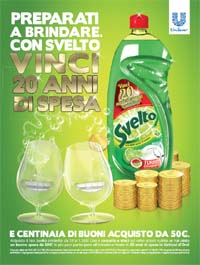 Nella stampa il visual, due bicchieri che brindano, riprende sia il concetto espresso dalla head che il richiamo al premio finale con la presenza di numerosi gettoni d’oro. Il radio invece si costruisce attorno ad un dialogo tra un piatto ed un bicchiere (gli stessi personaggi protagonisti dello spot tv) nel quale i due sono spiazzati dalla scoperta di qualcosa di più brillante di loro ovvero il nuovo concorso Svelto.