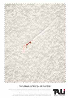 La campagna stampa, che richiama visivamente le provocatorie tele tagliate di Lucio Fontana, gioca iperbolicamente con la materia mostrando e dimostrando attraverso un’immagine d’impatto quanto può essere vera la finta pelle se è TA LI a garantirne la qualità. Una finta pelle talmente vera da essere viva.