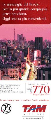 TAM Airlines, la più grande compagnia aerea in Brasile, unica in Italia a offrire voli diretti da Milano a San Paolo, lancia una nuova campagna stampa che verrà veicolata a partire dal 7 novembre 2011 fino al 22 novembre 2011, sul web, free press, media online, social media e su mezzi out of home, quali spazi in metropolitana. Contraddistinta da una creatività impattante e chiara, la campagna ha per oggetto la promozione della nuova e vantaggiosa tariffa che permette di viaggiare andata e ritorno da Milano a San Paolo con soli 770 euro in classe economica.