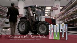 Siamo in un supermercato. Mentre l'altoparlante richiama l'attenzione della clientela sull'eccezionale vendemmia 2011, una bella donna dall'aspetto moderno e raffinato si avvicina con il suo carrello ai lineari del vino. Come prende una confezione di Tavernello bianco sente alle spalle un improvviso fruscio d'aria. Si volta e scopre che, magicamente, è comparso un gigantesco trattore siglato Tavernello. E' guidato da un uomo dall'aspetto di moderno, simpatico imprenditore vinicolo che si congratula con lei: "Brava, ottima