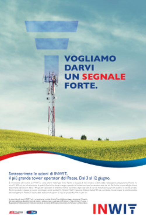 Telecom Italia comunica l’intenzione di promuovere un’offerta pubblica iniziale (“IPO”) avente ad oggetto una quota fino al 40% delle azioni ordinarie di Infrastrutture Wireless Italiane S.p.A., società interamente controllata attiva nel settore delle infrastrutture per le comunicazioni elettroniche (“INWIT”). L'annuncio avviene attraverso una campagna stampa nazionale pianificata su stampa, web e da giugno anche in radio, firmata stv DDB, che secondo quanto risulta ad ADVexpress si sarebbe aggiudicata l'incarico tramite una consultazione.