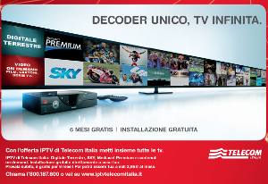 Il visual, una televisione 'amplificata' nella forma e nei contenuti, e il titolo 'Decoder unico, Tv infinita', ben rappresentano il servizio, che prevede un unico decoder digitale che consente, anche dopo lo switch off, la visione dei canali nazionali e locali del Digitale Terrestre, oltre a molti canali tematici, accedere ad un’ampia library di contenuti in modalità on demand senza vincoli di orario e di programmazione e attivare, su richiesta, anche le offerte Sky e Mediaset Premium.