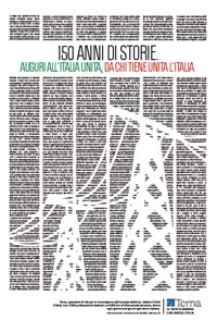 Terna sceglie Leo Burnett per celebrare i 150 anni dell’Unità d’ Italia. La collaborazione tra l'agenzia e il Gruppo energetico inizia con questo progetto affidato in maniera diretta.E nel celebrarli pensa a una campagna stampa che raccoglie 150 anni di date importanti, persone uniche, curiosità e invenzioni.