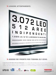 È on air da settembre sulle principali testate di settore la campagna stampa multisoggetto del nuovo Toshiba ZL1, il televisore top di gamma che, grazie al potente processore Cevo Engine, rappresenta la massima espressione dell’alta definizione oggi. Lo ZL1 è inoltre l’unico tv con 3.072 LED in 512 aree indipendenti. Ed è su questi numerie funzioni esclusive che si focalizza la campagna firmata TheCream, con la direzione creativa di Giorgio Bramante.
