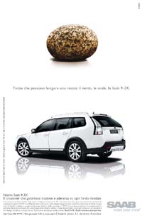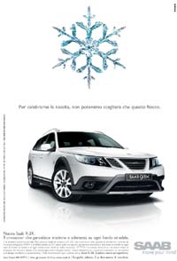 Attraverso meccanismi di analogia o contrapposizione con la Saab 9-3X, le immagini di una pietra, di un termometro, di un fiocco di neve e di un rampone si caricano di valore simbolico. Contestualmente le diverse headline contribuiscono ad esaltare i plus dell'auto: in particolare l’aderenza e il controllo, anche sulle superfici più insidiose (tanto da non doversi più preoccupare delle previsioni del tempo, come sottolinea uno dei titoli).