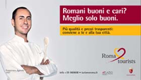 manifesti, radio locali, autobus, taxi, stazioni ferroviarie, depliant informativi presso gli alberghi di Roma, adesivi personalizzati da distribuire a tutti gli operatori turistici che aderiranno al progetto, riviste legate al mondo del turismo e della ristorazione .