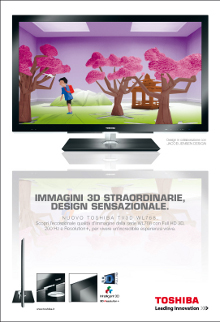 TheCream ha curato per l’Italia la comunicazione Toshiba. La campagna nasce per il lancio del nuovo TV 3D WL768, mix di tecnologia e design, e della gamma che include Blu-ray Player 3D e Notebook 3D Satellite A665. Un soggetto creativo ad hoc è dedicato al nuovo Toshiba Portégé R700, notebook innovativo per prestazioni e portabilità senza compromessi. Partita a metà novembre la campagna si sviluppa su stampa quotidiana e periodica, web, tv e anche al cinema con uno spot 30” che sarà on air fino a gennaio nel circuito Opus.Pianificazione media a cura di M,C&A Mediavest.