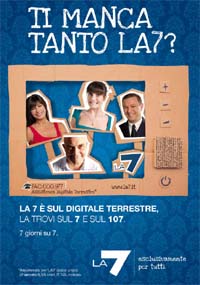 Dal 12 aprile, La7 è on air nel Lazio e in Campania, con una nuova campagna geolocalizzata dedicata al palinsesto primaverile e alla sintonizzazione dell’emittente sul digitale terrestre.Il format creativo, sviluppato su cinque soggetti e declinato su affissione, stampa e videocomunicazione, mostra un televisore di cartone da cui fanno capolino le sagome di alcuni tra i volti più noti e rappresentativi della rete. Il visual presenta un’ironica La7 immaginata dagli utenti che non hanno ancora memorizzato il canale ma desiderano continuare come sempre a vivere il ricco palinsesto di rete attraverso i programmi della stagione.