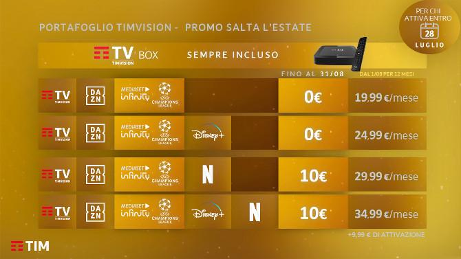 Dal 28 luglio il prezzo di listino dell’offerta TimVision, DAZN e Mediaset Infinity sarà 29,99€ al mese, mentre per il pacchetto completo sarà di 44,99€ al mese.