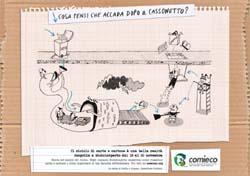 Per questo la campagna racconta un ciclo piuttosto fantasioso: tra la carta nel cassonetto e il nuovo oggetto che se ne ricava, in mezzo seguiamo l’attività di nani, saltimbanchi, curiosi animali, astrusi meccanismi… mentre la head chiede ”Cosa pensi che accada dopo il cassonetto?”.