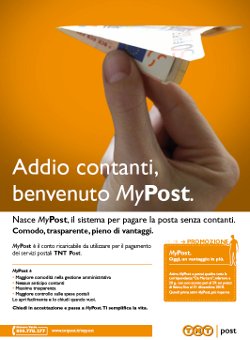 TNT Post, il primo operatore postale privato in Italia, annuncia oggi il lancio di MyPost, il primo conto virtuale ricaricabile per la gestione dei servizi postali di professionisti e piccole e medie imprese, che potranno così pagare la posta senza contanti.Il servizio consente la riduzione delle pratiche amministrative, garantisce il completo controllo nella gestione della spese attraverso un 'estratto conto online', oltre alla possibilità di controllare lo stato delle spedizioni. L’attivazione, da effettuare presso uno dei punti di accettazione di TNT Post, con un piccolo costo iniziale (una tantum), permette di ricaricare il conto dando la possibilità di utilizzare i servizi Formula Certa, il sistema di recapito a controllo satellitare che certifica la consegna di ogni invio di corrispondenza, di inviare Raccomandate e Formula Simply Direct, l’offerta di TNT Post per il Direct Mailing. Inoltre il prodotto permette un’estinzione libera con rimborso tramite contanti.