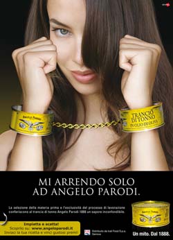 Una donna, che rappresenta il core target e il principale responsabile d’acquisto del prodotto, esibisce in primo piano, con sguardo fiero e ammiccante, le sue braccia ammanettate. Le manette non sono però due manette convenzionali, ma due confezioni vuote di Tonno Angelo Parodi. Il gioco è chiarito dall’headline che recita: 'Mi arrendo solo ad Angelo Parodi'.
