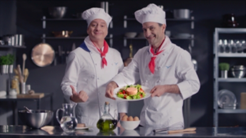 Grazie a questo storytelling, la comunicazione Mare Aperto usa lo stereotipo di due Chef ai fornelli che alla fine preferiscono la sana sincerità del nuovo brand.