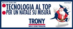 Previsto per la circostanza il lancio di un nuovo volantino, realizzato in un formato inedito e dalle dimensioni maggiormente contenute: la grafica evidenzia le offerte in promozione organizzandole per fasce di prezzo, al fine di agevolare il lettore nella consultazione e consentirgli di individuare il regalo preferito fra diverse soluzioni di spesa. Sarà distribuito su tutto il territorio nazionale e visionabile anche sul sito istituzionale www.trony.it. Il titolo del tabloid riprende quello della promozione: 'Tecnologia al top per un Natale su misura'.