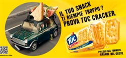 L’idea creativa esprime con un’iperbole il giusto equilibrio tra gusto e quantità offerti da una porzione di Tuc Cracker. Il primo soggetto tv vede protagonista un ragazzo fermo in auto che, colpito da un attacco di fame, apre ignaro il suo tramezzino preparato a casa, ritrovandosi improvvisamente schiacciato nell’abitacolo dal tramezzino stesso, cresciuto a dismisura. Il giorno successivo il ragazzo, forte dell’esperienza, non commette lo stesso errore e apre un pacchetto di Tuc Cracker.