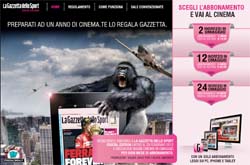 Il 14 dicembre è iniziata la campagna abbonamenti alle edizioni digitali del quotidiano sportivo che, grazie a QMI, regalerà un carnet di buoni digitali iovadoalcinema pass a tutti coloro che entro il 29 febbraio sceglieranno una delle formule di abbonamento previste dalla promozione www.gazzetta.it/cinemagratis.