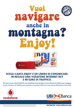 E’ on air la nuova campagna promozionale di UBI Banca, in collaborazione con Vodafone Italia, per il lancio della carta conto Enjoy, la carta che rende liberi di comunicare.Sottoscrivendo Carta Enjoy, i clienti riceveranno in regalo una internet key e una sim voce, avendo l’opportunità di essere sempre connessi, alla propria banca e ai propri amici.