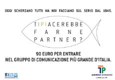 La campagna (Copy Simona Sebastio e Luca Guastini - Art director Piero Pessina) nasce con 5 soggetti teaser, un soggetto 1° d'aprile e un soggetto Istituzionale a partire dal 2 aprile. La campagna è già partita on line e su alcune testate di categoria. Il concept è molto semplice e si intuisce fin dal primo Teaser: si gioca sui numeri e sulla qualità di TP per ribadirne l'unicità nel panorama delle associazioni di comunicazione sia individuali sia di società, tra tutte l'unica, come testimonianza anche terza, ad avere ottenuto il certificato di qualità UNI EN ISO 9001:2008.