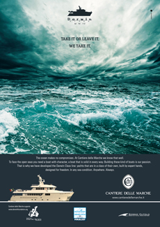 Dopo aver curato nel 2011 il lancio sul mercato della linea di yacht da 86 piedi realizzata dal cantiere di Ancona e dedicata al grande naturalista inglese, l’agenzia guidata da Lorenzo Cascino lancia la nuova campagna Darwin Class, linea che oggi si arricchisce dei modelli da 96 e 115 piedi. La campagna dell’anno scorso puntava sul concetto di evoluzione, presentando lo yacht come una vera e propria specie marina, un predatore con caratteristiche nuove e importanti, capace di adattarsi ad ogni ambiente. Tenendosi sulla stessa lunghezza d’onda, la nuova campagna rilancia i principali plus dello yacht, cioè potenza, solidità, affidabilità. Darwin Class è un’imbarcazione fatta per sfidare il mare e per vincere questa sfida, anche in condizioni climatiche proibitive per la maggior parte delle altre barche.