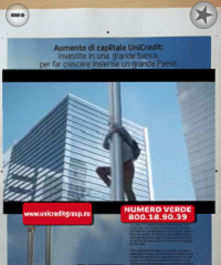 Il tutto grazie all’applicazione Aurasma, disponibile gratuitamente per smartphone e tablet e inserita fluidamente nella campagna di MediaCom dedicata all’Aumento di Capitale UniCredit. Inquadrando la creatività stampa con il proprio dispositivo mobile, infatti, l’utente vede l’annuncio pubblicitario trasformarsi nel video della campagna e può collegarsi in maniera totalmente integrata con il call center telefonico e con il sito internet UniCredit, attraverso due links distinti e dedicati.