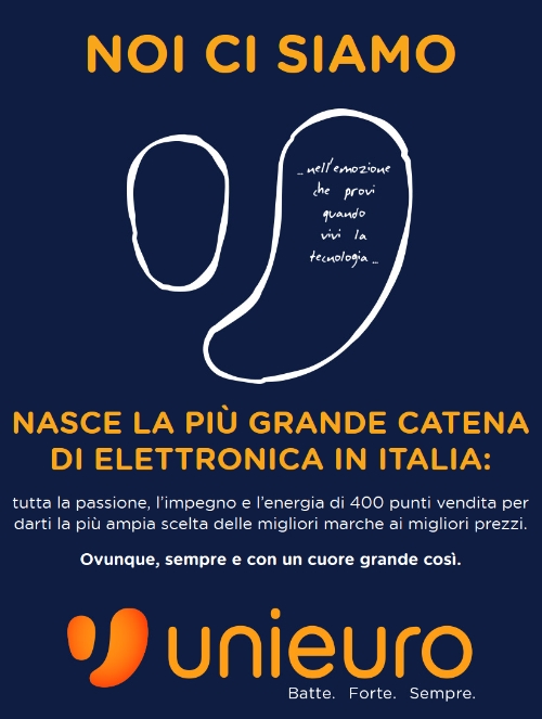 A chiusura delle attività di rebranding che hanno visto l’azienda forlivese completare in soli 4 mesi il cambio insegna su oltre 400 punti vendita in tutta Italia e su tutti i canali digitali, il gruppo SGM Distribuzione è on air dal 7 ottobre con una campagna istituzionale su tutti i principali mezzi di comunicazione, online e offline. Il messaggio vuole dare un ruolo attivo a Unieuro, che facilita la relazione fra le persone e la tecnologia e che fa leva sulle emozioni, sulla passione e sulla vicinanza al cliente grazie a un approccio multicanale, che integra la più capillare rete di punti vendita in Italia e tutti i punti di contatto digitali, dal sito di ecommerce responsive, alle app mobile, ai profili social. La campagna, on air fino a sabato 18 ottobre, è stata pianificata da Media Italia in TV (Terrestre e satellitare) sui social, come facebook e twitter, in radio, sui portali e siti web. Pianificazione digital a cura di E3. Regia di Luca Lucini.