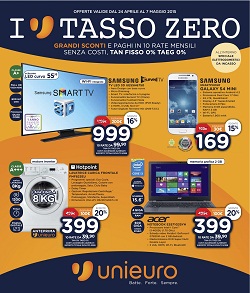 Nuova campagna sconti da Unieuro, valida da venerdì 24 aprile a giovedì 7 maggio, grazie alla quale, oltre a poter scegliere tra numerose offerte su tutte le categorie di prodotto, sarà possibile ottenere finanziamenti a Tasso Zero (in 10 rate mensili senza costi aggiuntivi) su tutti gli acquisti superiori a 299 euro.All'interno del volantino è stato poi previsto uno speciale dedicato agli elettrodomestici da incasso; fiore all'occhiello una promozione in anteprima solo da Unieuro: acquistando il forno di nuova generazione segnalato - in regalo il piano cottura ad induzione di valore pari a 599 euro.
