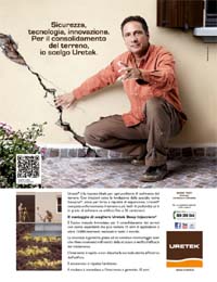 Prende il via la nuova campagna di Uretek con la creatività di Ldb Advertising. L’obiettivo di comunicazione è sostenere la leadership del marchio, specifico per il consolidamento del terreno con resine espandenti. La promessa del brand - sicurezza, tecnologia, innovazione - è sostenuta dalla scelta di un testimonial d'eccezione: Mario Tozzi, geologo e consulente televisivo per programmi conosciuti a livello nazionale come Gaia - Pianeta che vive e Terzo Pianeta. La campagna è pianificata sulle principali riviste settimanali e mensili e sui principali portali di settore, rivolti al target professionale e all’utente finale. Anche su internet Uretek ha pianificato con video e demo 3d dedicati al mondo professionale e al target consumer. Per Ldb hanno lavorato: Paolo Pasini, direttore creativo e art; Stefano Fabbri, copy; Antonella Munari, direttore clienti; fotografo, Giovanni Bortolani.