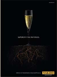 'Supeiori fino in fondo' è il claim istituzionale che esplicita il visual che ha come protagonista un calice di vetro cristallino con radici di vite colmo del suo spumante Prosecco e mosso da un perlage finissimo e persistente. Una sorta di calice di vite e di vita radicato nel terreno, a rappresentare sia un esplicito omaggio alla etimologia del brand - Valdo/Valdobbiadene - sia l’anello di congiunzione ideale dei valori connotativi della marca Valdo Spumanti che dal 1926 scambia e condivide idee, passione e valori con il territorio di appartenenza. A chiusura il pay off 'Dalle terre di Valdobbiadene, la storia del prosecco'.