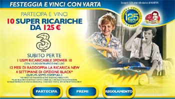 Dal 26 novembre al 9 dicembre 2012 una campagna a supporto della promozione 'Festeggia e Vinci con Varta' che vede coinvolta anche 3 Italia e che mette in palio, acquistando un blister di batterie alcaline della linea High Energy e delle ricaricabili Easy Line, lschede ricaricabili di “3” e consente di partecipare all'estrazione finale per vincere una delle 10 super ricariche telefoniche da 125 euro in palio.