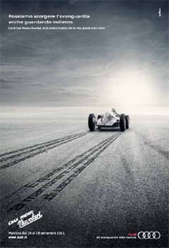 Verba ha sviluppato per Audi una campagna di comunicazione che si sviluppa su stampa specializzata, stampa locale e maxi-affissioni. La comunicazione si basa sull’idea che per poter scorgere l’avanguardia, di cui Audi è da sempre portavoce, non bisogna necessariamente guardare al futuro. Alcuni grandi esempi d’innovazione, infatti, appartengono al passato. Nel visual vediamo la mitica Auto Union di Tazio Nuvolari che sfreccia via, scrivendo sull’asfalto la storia dell’automobilismo.