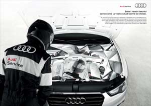 'Solo i nostri tecnici conoscono la vostra Audi come se stessi', recita la line e il visual mostra un vano motore, completamente rivestito di specchi, che rimanda proprio l’immagine di un tecnico, a sottolineare la totale compenetrazione tra lui e l’auto, ma anche la sua compartecipazione ai valori di tecnologia e progresso che sono propri del marchio di Ingolstadt.