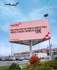 La nuova compagnia aerea lowcost di Venezia per comunicare l'operatività nel triveneto, è attualmente presente sul Nord Est con un piano outdoor che comprende, oltre le affissioni sul piccolo e grande formato nelle città di Padova, Treviso, Vicenza, Venezia e Pordenone dei circuiti di Clear Channel, anche il network dell’aeroporto di Venezia gestito da 2A-Airport Advertising
