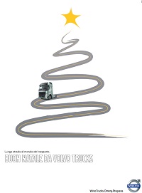Zero-Starting Ideas firma un nuovo annuncio per Volvo Trucks: una pagina rivolta al mondo dei trasporti su strada per fare gli auguri di un buon Natale. Nel visual una strada si snoda a zig zag ridisegnando la sagoma dell’albero di Natale e un truck Volvo viaggia idealmente dalla stella cometa fino all’headline con gli auguri alla base dell’albero. In chiusura la baseline 'lunga strada al mondo dei trasporti' riprende creativamente il tema della pagina ma apre anche al futuro.