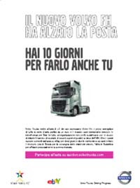 Zero-starting ideas firma il nuovo soggetto stampa per Volvo Trucks dedicato al nuovo Volvo FH, che a vent’anni di distanza dal lancio del penultimo modello, vuole rappresentare l’eccellenza della tecnologia, del design e anche della social responsability. Un veicolo che fissa i nuovi standard della categoria, o che 'Alza la posta' come suggerisce l’headline, a tutto beneficio di un mercato sempre più attento ed esigente. E cosa c’è di meglio se dopo aver appunto alzato la posta, si invita il lettore a fare altrettanto, ovvero a fare offerte generose per accaparrarsi un esemplare pregiato e nel contempo sostenere un generoso progetto di charity? Per la prima volta, Volvo Trucks mette all’asta un veicolo, anzi il primo veicolo di tutta la nuova serie Volvo FH, quindi un camion da collezione, con una base di partenza di un euro.