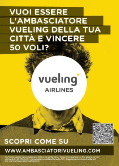 Gli ambasciatori saranno i testimonial di Vueling in Italia, vinceranno 50 biglietti gratuiti per viaggiare nel 2014e potranno provare per primi ed in esclusiva tutti i nuovi prodotti, servizi e rotte della compagnia aerea. Gli ambasciatori, inoltre, saranno invitati a provare la Vueling Experience, attraverso una visita agli uffici di Barcellona e alloggiando presso il Vueling Hotel, per poi partecipare a tutti gli eventi che Vueling organizzerà durante l’anno.