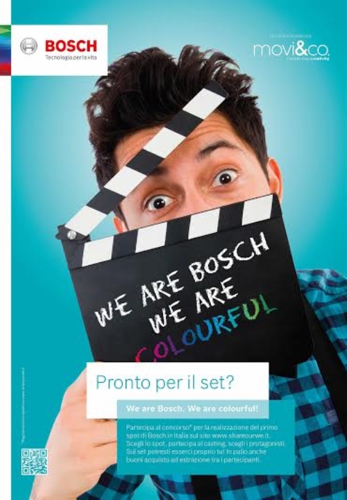 We are Bosch. We are Colourful! intende avvicinare il concetto di tecnologia sofisticata di Bosch alla semplicità della vita, attraverso la realizzazione di uno spot che sia efficace ed emozionale. Il compito di interpretare la trasformazione di Bosch e tradurla in immagini sarà affidato ai giovani videomaker scelti dall’associazione Movi&Co: protagonista assoluto sarà il collaboratore Bosch, reale testimone della nuova direzione del brand.
